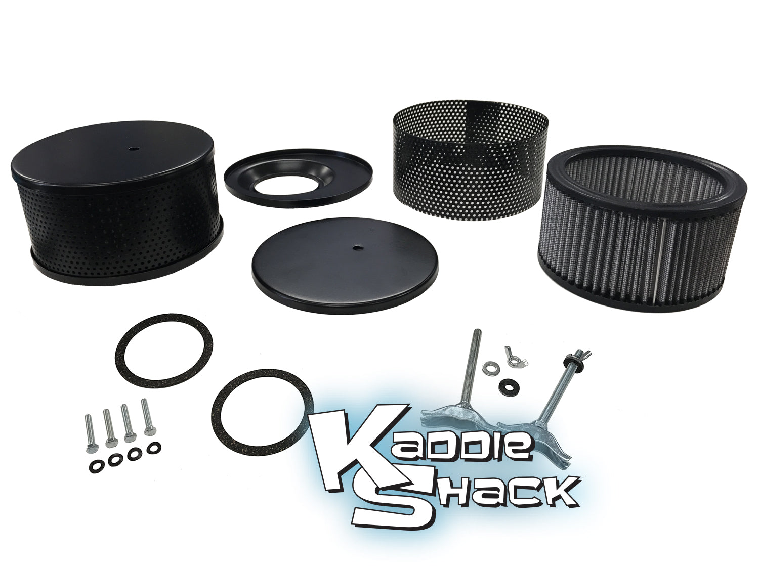 These "Vintage Style" air cleaners add a great look to any Kad-Powered engine, while retaining excellent flow characteristics for performance. Air cleaners are sold in complete sets covering both carbs. They measure 3-3/4" high overall from the bottom of the air cleaner base (where it mounts to the carb) to the top of the air cleaner lid, which is slightly lower than the standard aftermarket ones where space is tight. They all feature a powder-coated finish on the lids, bases, and cages, except the models with the chrome lids. We have several different color combinations available: