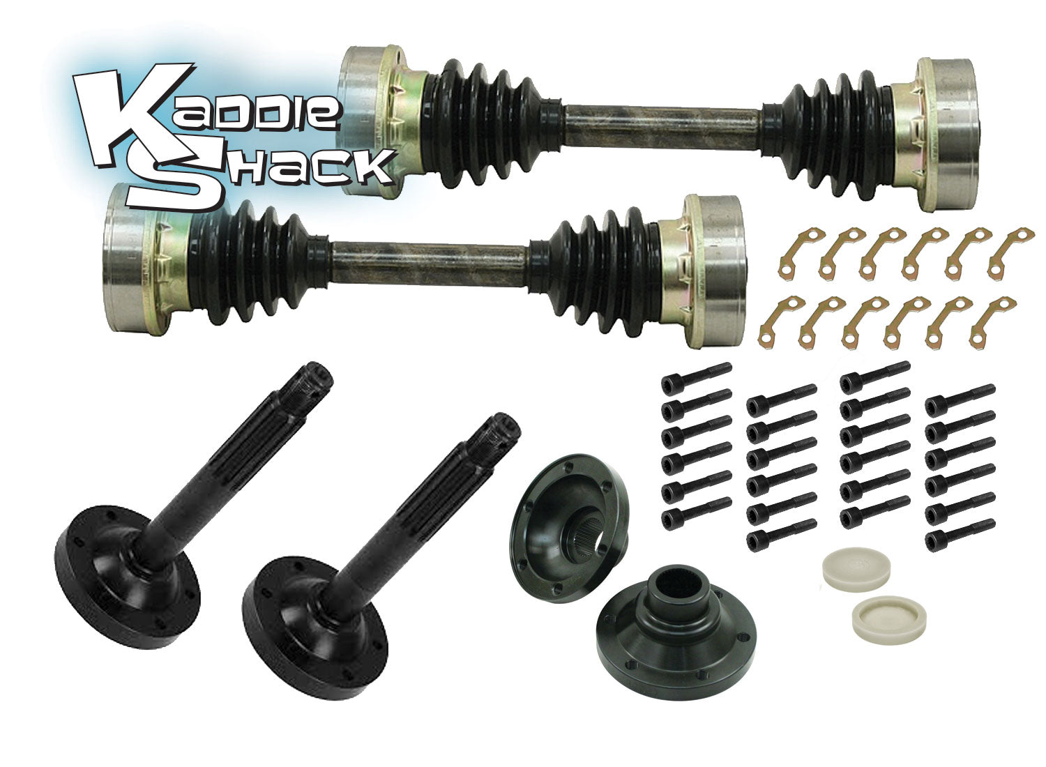 This kit converts your Type 1 IRS rear drive axle to the larger and much stronger Bus components, as used in the '73 and '74 VW Thing. This kit is commonly used in street or strip cars with high output motors and off-road cars that take a beating! All components simply bolt right in to complete your conversion. We have used and tested this same kit in our own drag cars and off road cars and never had a single failure. CV joints are factory rated for 17 degrees of travel, but we have successfully run them up to 22 degrees! All components are included to complete the conversion:
